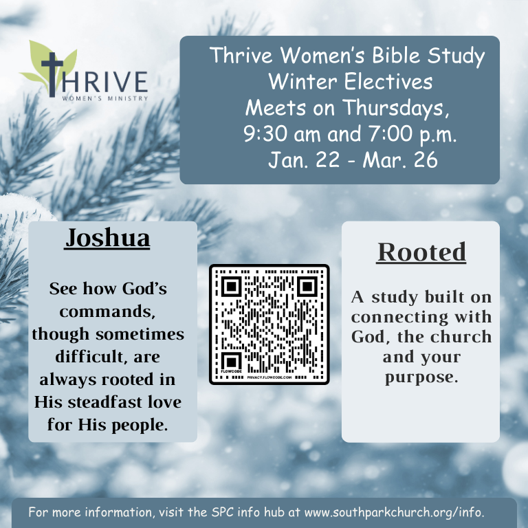 THRIVE Women's Ministry exists to help women become rooted and built up in Christ, established in the faith, thrive in the abundant life available through Christ, and connect in community by providing Bible study, fellowship, and worship.