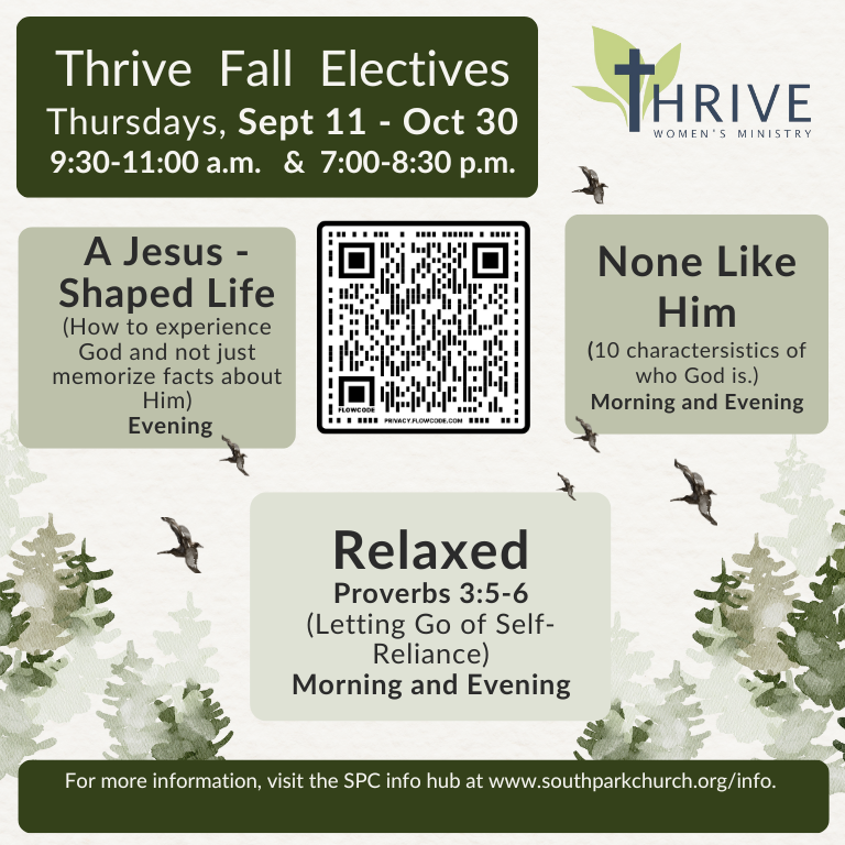 This fall, we’re offering three evening electives and two morning options—each one created to help you dig into God’s Word and draw closer to Christ in a way that speaks to your heart. Whether you’re craving spiritual renewal, community, or just a moment to breathe and refocus, there’s something here for you.